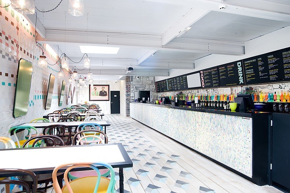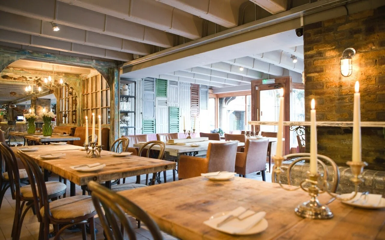 An eclectic hacienda-style, warm and rustic interior featuring antiquated architectural details, reclaimed islamic and Parisian louvre shutter doors and gothic church windows. A long bar where diners can sit and enjoy a selection of tapas and a sherry dates back to the 1800s and was salvaged from a Welsh church, whilst the bar stools are former tractor seats, with cushions made from grain sacks.