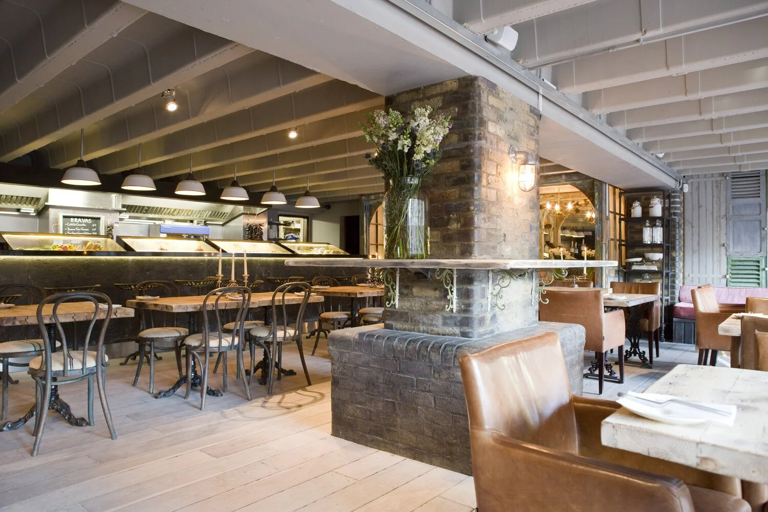 The interior is inspired by Barcelona’s elegant-but-casual beachfront restaurants offering a laid back atmosphere designed to let the food do the talking. The open kitchen takes center stage, the wrap around bar top was created by hand using a selection of hard woods such as maple, cherry and oak which we joined. The bar facade is metro tiles in a herringbone design on a floor constructed from reclaimed scaffolding boards. The walls are venetian plaster, chairs reclaimed for an old church are upholstered with calico linen creating a warm and authentic, understated and utilitarian aesthetic.